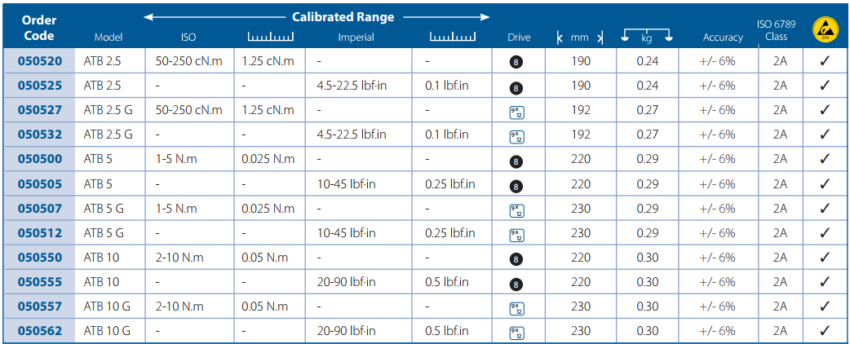 -Thông số chính của cờ lê lực đầu rời ATB 10 G như sau :