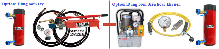+ Kích thủy lực hoạt động nhờ hệ thống cung cấp dầu bởi Bơm tay thủy lực hoặc bơm điện thủy lực.