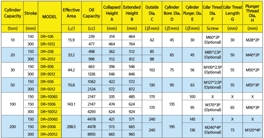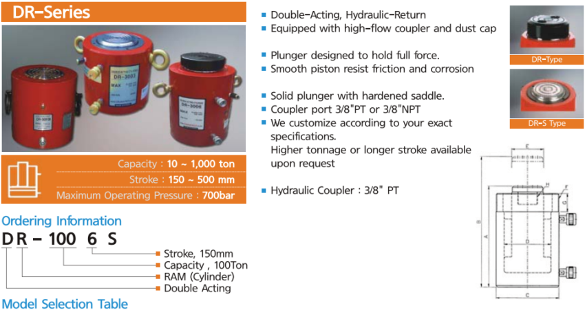 Kích thủy lực 2 chiều( Hydraulic Double Acting Cylinder) DR-1012( 10 tấn, 300 mm) được sản xuất bởi DAEHA/Korea