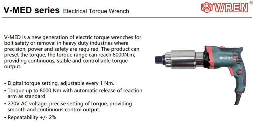 – Súng siết bu lông định lực chạy điện Wren V-MED60(600-6.000 Nm) được sản xuất bởi hãng Wren/China.